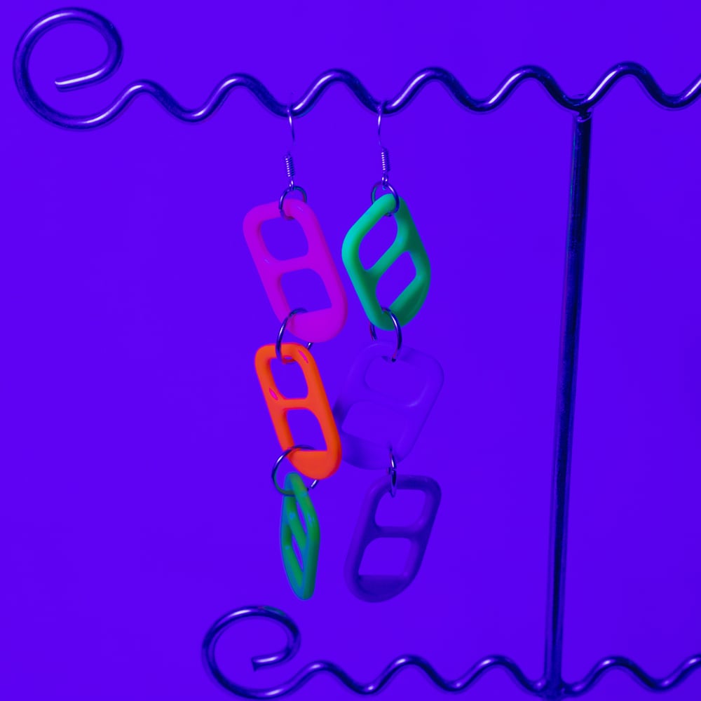 UV reactive dangle earrings of circus soda shop dreams! Made with plastic pop tabs and available on hooks, clip-ons, or leverbacks!