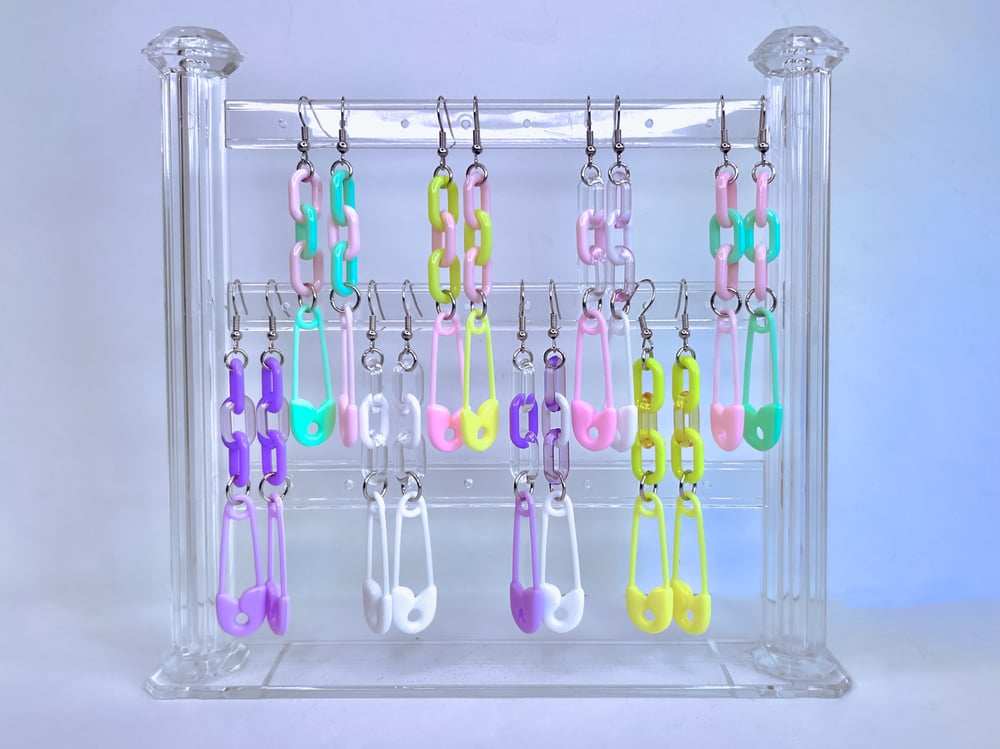 UV reactive! Pastel dangle earrings made with plastic chain links and safety pins. Available on hooks, clip-ons, or leverbacks!
