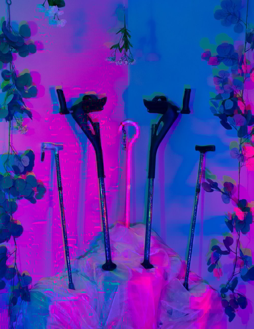 Print 1: “SICK STICKS” - 8.5x11 photo print of various canes and a pair of platform forearm crutches on a fancy white platform and surrounded by plants in saturated pink and blue lighting. On pro luster photo paper