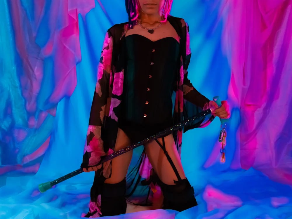 Print 2: “BRACED & LACED” - 8.5x11 photo print of a black non-binary person kneeling in front of a blue and pink background of flowy fabrics. They are wearing a black corset, black underwear, & a black garter belt that is connected to their knee braces. They are holding a black hologrpahic cane diagonally in front of them with both hands. On pro luster photo paper.