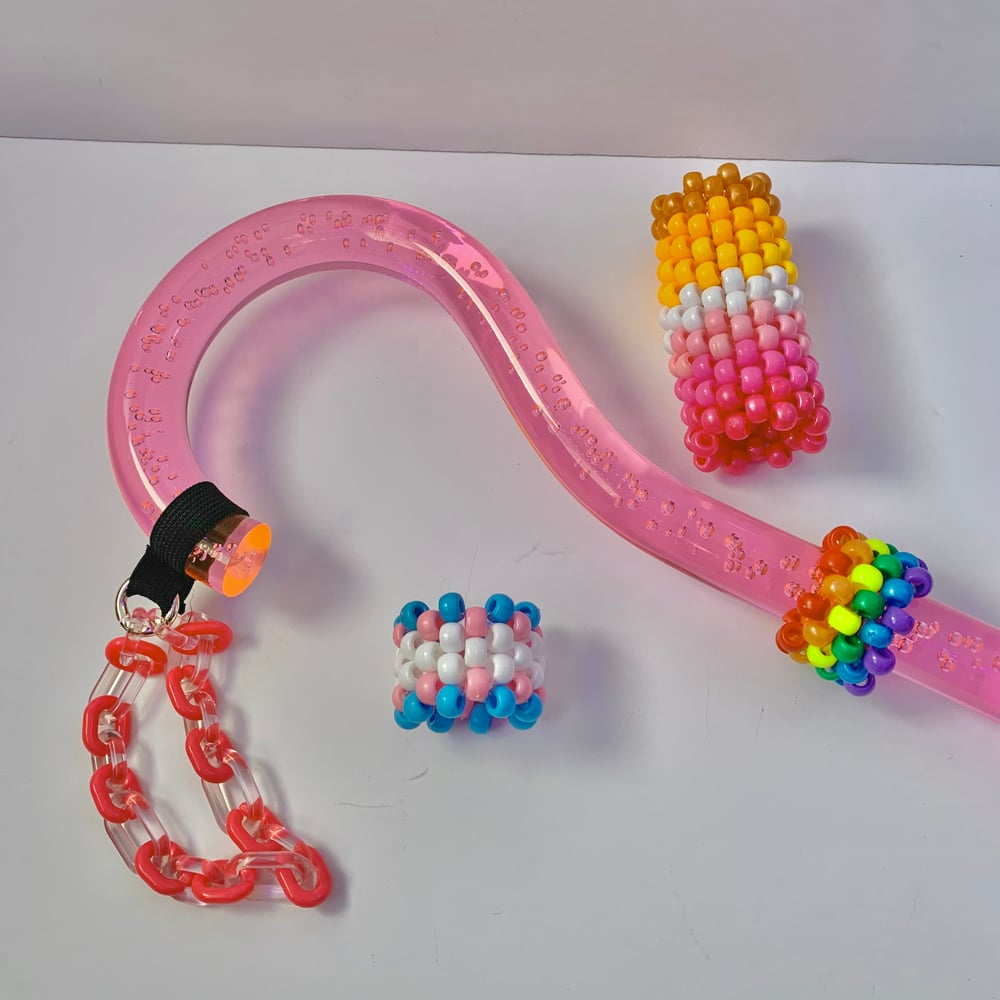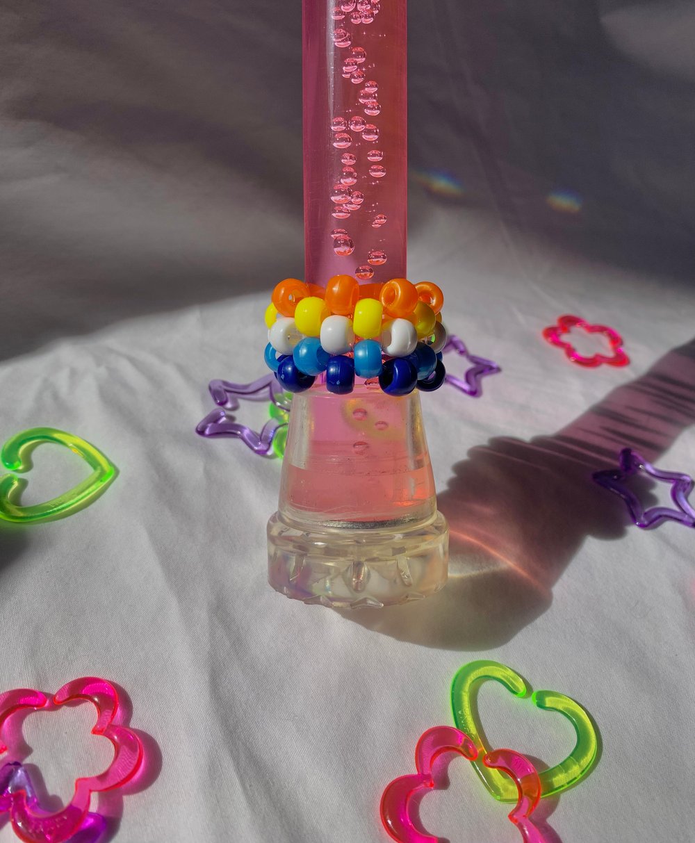 1pc beaded stick cuff in a variety of fun colors and patterns; including the following pride flag colors: gay, trans, lesbian, bi, pan, disabled, nonbinary, aroace, genderfluid, genderqueer, and asexual. Pastel rainbow & purple + white cuffs glow in the dark!