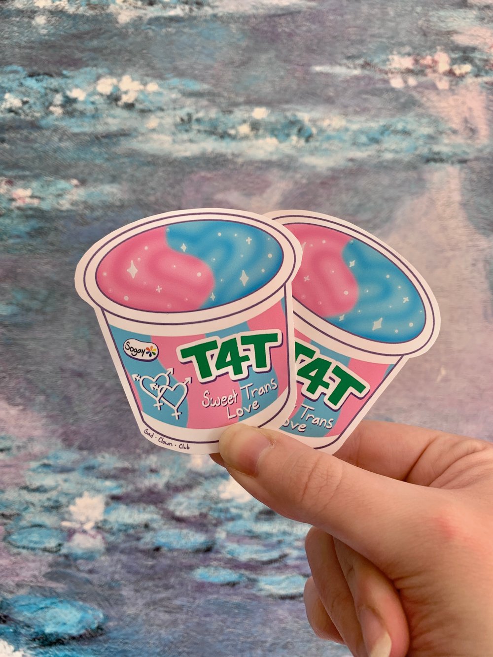 ~3" vinyl stickers featuring a sparkly yogurt cup with a label that reads "T4T" with the flavor name "Sweet Trans Love". Available in matte, glossy, and holographic finishes! (water resistant except matte)